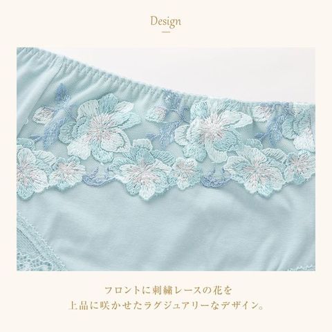 フロントには刺繍レースの花を上品に咲かせたラグジュアリーなデザイン。身生地には良く伸びるオーガニックコットン混素材を使用し、ほどよいフィット感に仕上げています。