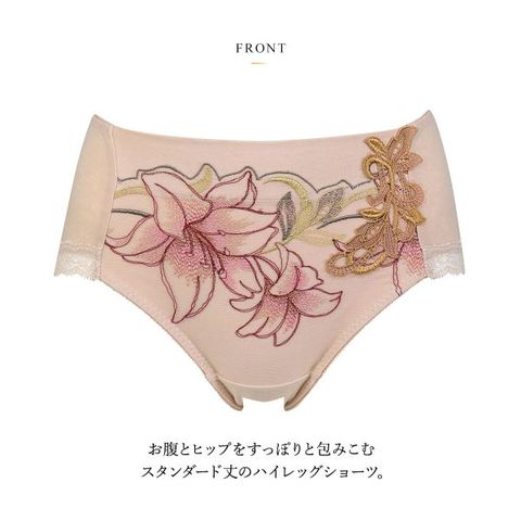 お腹・ヒップをすっぽりと包みこむスタンダード丈のハイレッグショーツ。身生地は優しい肌あたりがここちよい綿混ベア天竺素材を使用。縦横ななめにやわらかな伸縮性があり、ヒップの丸み・動きにも心地よくフィットします。