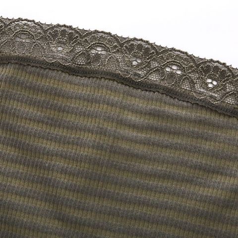 脇に縫い目のない丸編タイプなので、ストッキングやガードルを重ねても縫い目があたりにくい仕様です。身生地は縦横ななめにやわらかく伸縮し、吸汗速乾性がよい軽やかな針抜きボーダー素材素材で、むれにくくここちよいフィット感。