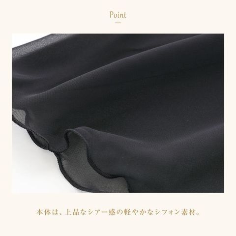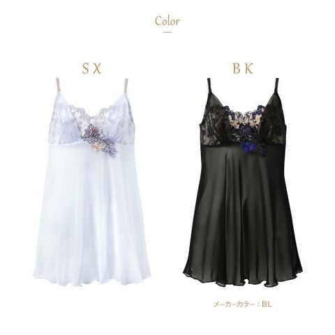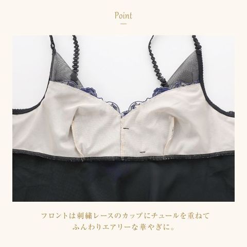 フロントは刺繍レースのカップにチュールを重ねてふんわりエアリーな華やぎに。本体は上品なシアー感の軽やかなシフォン素材で、流れるようなフレアーシルエットに仕上げています。