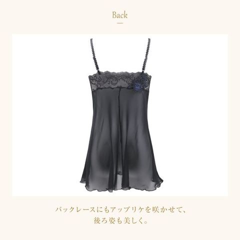 バックレースにもアップリケを咲かせて、後ろ姿も美しく。気分を上げたい日のお出かけインナーはもちろん、優雅にくつろぎたい日のおうちインナーにもおすすめです。