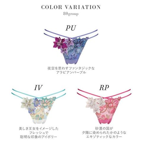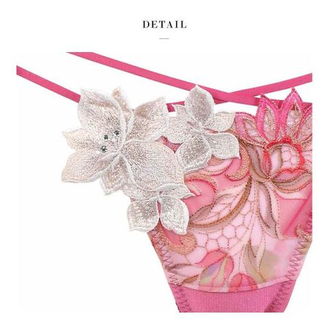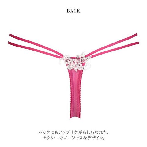 フロントは裏打ち付きで透けにくく、やさしい肌あたり。バックにもアップリケがあしらわれた、セクシーでゴージャスなバックデザインです。