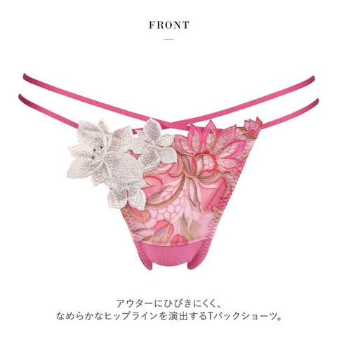 アウターにひびきにくく、なめらかなヒップラインを演出するTバックショーツ。華奢なループがフロントでクロスするセクシーなデザインです。