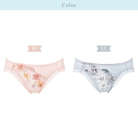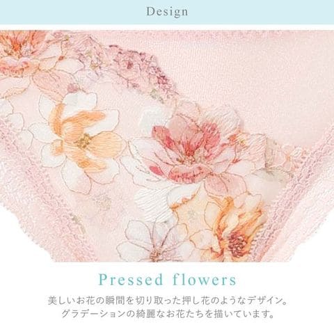 デザインテーマは「Pressed flowers(押し花)」。美しいお花の瞬間を切り取った押し花のようなデザイン。グラデーションの綺麗なお花たちをブラジャーのサイドレースに描き、メイン使いのラッセルレースには細かいゴールドのラメ糸がキラキラと煌めいています。