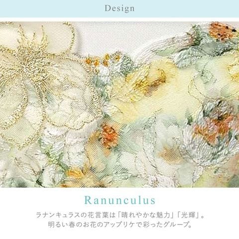 テーマは「Ranunculus(ラナンキュラス)」。ラナンキュラスの花言葉は「晴れやかな魅力」「光輝」。明るい春のお花のアップリケで彩ったグループです。朝のしずくのようにラインストーンがキラキラと輝き、アクセントに。