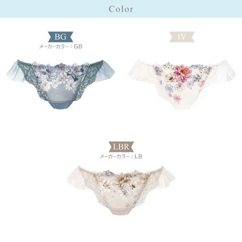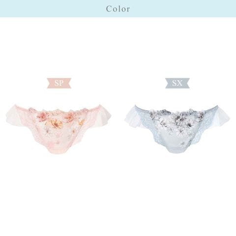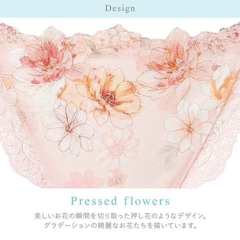 デザインテーマは「Pressed flowers(押し花)」。美しいお花の瞬間を切り取った押し花のようなデザイン。グラデーションの綺麗なお花たちをブラジャーのサイドレースに描き、メイン使いのラッセルレースには細かいゴールドのラメ糸がキラキラと煌めいています。