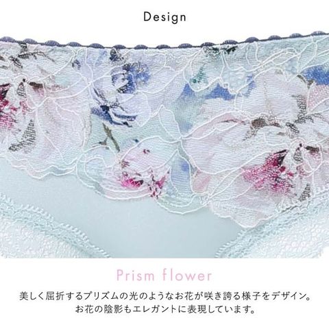 「Prism flower(プリズムフラワー)」をテーマに、美しく屈折するプリズムの光のようなお花が咲き誇る様子をデザイン。お花の陰影もエレガントに表現しています。コード糸を使用したラッセルレースにプリントをほどこしています。