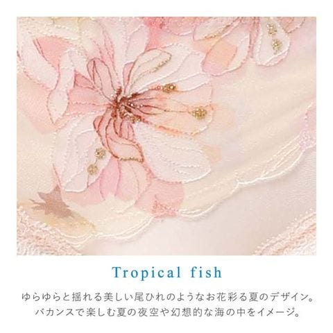 ゆらゆらと揺れる美しい尾ひれのようなお花彩る夏のデザイン。バカンスで楽しむ夏の夜空や幻想的な海の中をイメージ。シアーなデザインは涼しげで、ひびきにくい刺繍仕上げ。