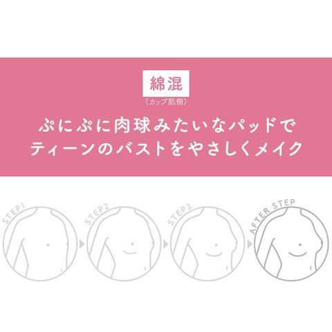 成長期の胸に合わせた広めのワイヤー設計で、包みこむようなやさしいフィット感に。カップ内側のパッドポケットは、なめらかな綿混素材を使用して肌ざわりもやさしく。