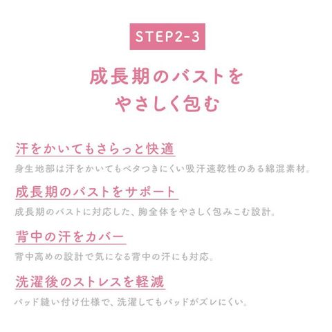 成長期のバストに対応した胸全体をやさしく包み込む設計で、成長期のバストをサポートします。パッドは縫い付け仕様なので着用時や洗濯時にズレにくいのも嬉しいポイント。