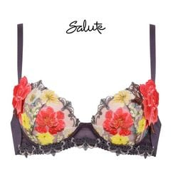 色とりどりの花が咲き誇る華麗な胸もとと、ほどよい透け感のシフォン生地のコンビネーションが美しいスリップ。