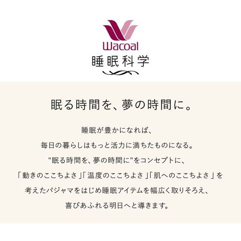 「動きのここちよさ」「温度のここちよさ」「肌へのここちよさ」を考えたパジャマをはじめ睡眠アイテムを幅広くそろえ、喜びあふれる明日へと導きます。