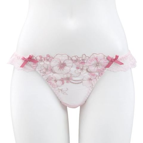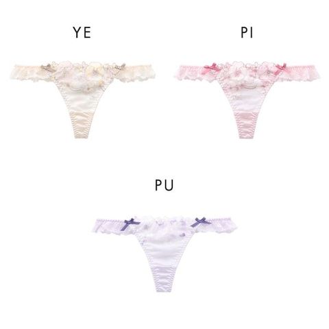 カラフルなパステルフラワー刺繍に心ときめくTバックショーツ。サテンのミニリボンが可愛らしいアクセントになっています。