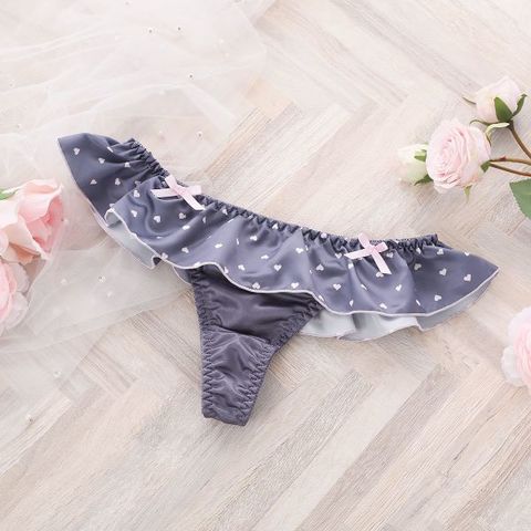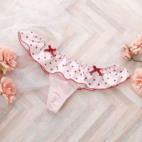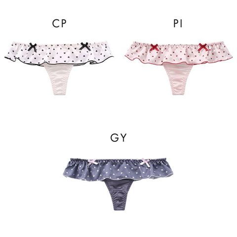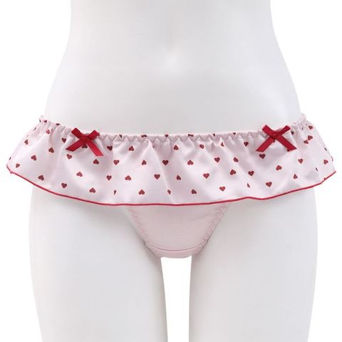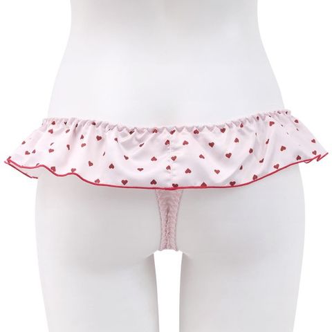 ミニハート柄のサテンフリルが可憐な表情を演出するTバックショーツ。