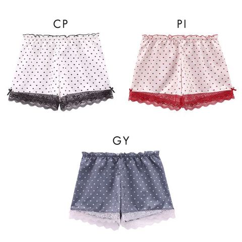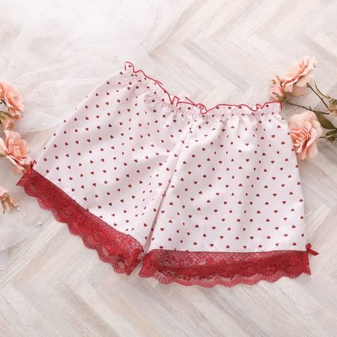 ミニハート柄のサテンにレースのあしらいでセクシー&キュートに仕上げたタップパンツ。レースと同色のミニリボンをサイドに付けて、アクセントを添えています。