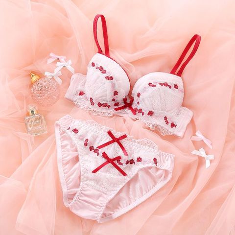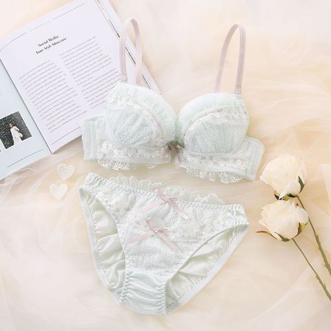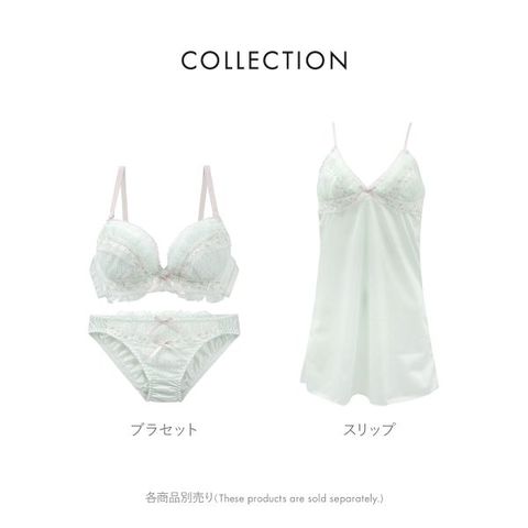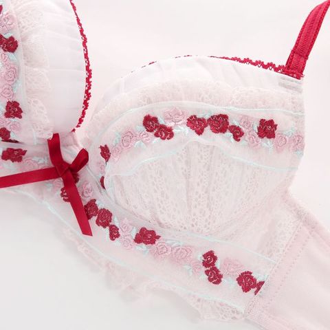 オールオーバーレースに、カラフルな小花刺繍のチュールをアクセントにあしらった、キュートなブラセット。サテンリボンとレースフリルで、より一層ガーリーな雰囲気に。
