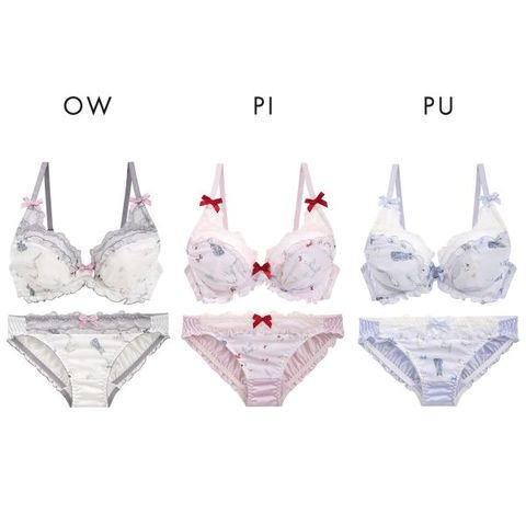 色んな種類の猫を水彩タッチで優しく描いた、ふんわりシフォンのキュートなブラセット。配色サテンリボンやひらめくフリルがアクセントになっています。