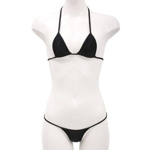 つるっとしてさらっと滑らかなスペシャル素材と、濡れたような光沢が美しい水着素材を使用。面積は非常に小さいながらも抜群の存在感を放つマイクロブラに、シャープなカッティングのTバックショーツがセットになっています。