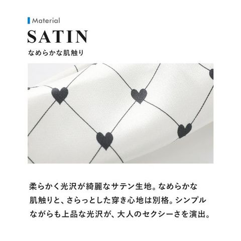 光沢が美しいハート柄のサテン生地を使用し、可愛らしさの中にも洗練されたセクシーさを演出します。カップ部分は従来のものよりも高さを出して、もっこり感をアップ。ウエストにはサイズ調整可能なマイクロゴムを使用し、最高のフィット感を追求しました。フロントフルシームで美しいラインを保ち、M/Lサイズ展開です。