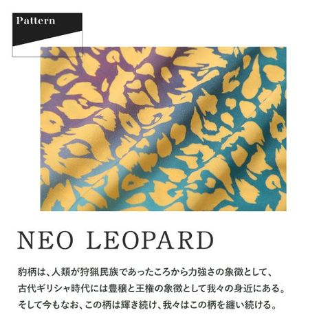 【NEO LEOPARD】豹柄は、人類が狩猟民族であったころから力強さの象徴として、古代ギリシャ時代には豊穣と王権の象徴として我々の身近にある。そして今もなお、この柄は輝き続け、我々はこの柄を纏い続ける。
