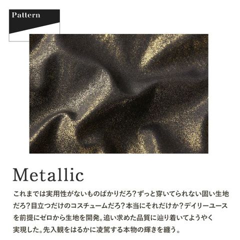 【Metallic】これまでは実用性がないものばかりだろ?ずっと穿いてられない固い生地だろ?目立つだけのコスチュームだろ?本当にそれだけか?デイリーユースを前提にゼロから生地を開発。追い求めた品質に辿り着いてようやく実現した。先入観をはるかに凌駕する本物の輝きを纏う。