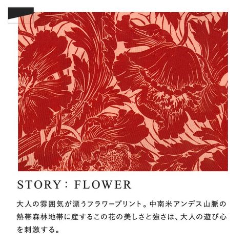 グレイブボールトに相応しい大人な雰囲気のフラワープリント。中南米アンデス山脈の熱帯森林地帯に産するこの花の美しさと強さは、大人の遊び心を刺激する。