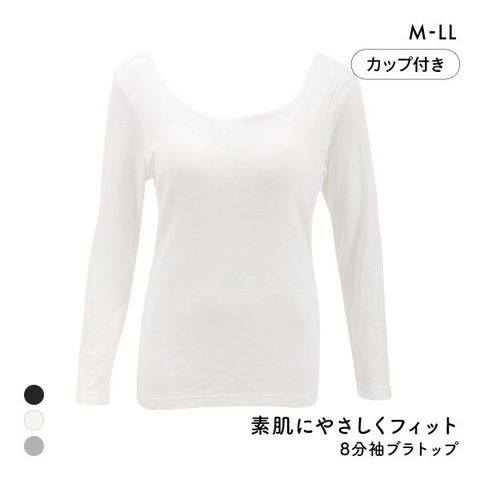 素肌にやさしくフィット 綿100% ブラトップ カップ付き 長袖インナー 8分袖トップス M L LL ロンT ロングTシャツ 敏感肌 肌着