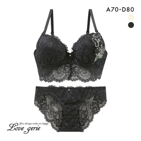 カップ下までレースをふんわりあしらったジレ風の総レースブラショーツセット。ローズ&バタフライモチーフの優美なアップリケや胸元のリボンチャームが華やかな愛らしさをプラス。