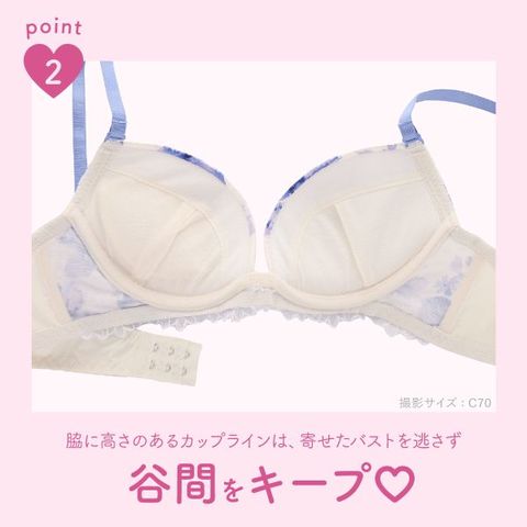 L字ワイヤーで前中心のワイヤーのあたりをなくした、様々な体型に合わせやすいパターン。脇に高さのあるカップラインは、寄せたバストを逃さず谷間をキープし、バストの中心にワイヤーが当たってしまう問題を解決!