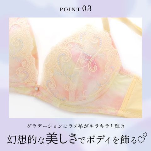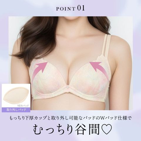 ブラはもっちり下厚モールドカップ+取り外し可能なパッドのWパッド仕様でむっちり谷間をメイク。バストボリュームの調整ができるのも嬉しいポイントです。