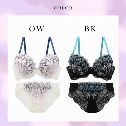 重ねた花びらを羽根モチーフに見立てた、存在感のあるレースデザイン。3色の色糸を鮮やかに切り替え、ストラップも刺繍に合わせた配色使いにすることで洗練された印象に仕上げています。