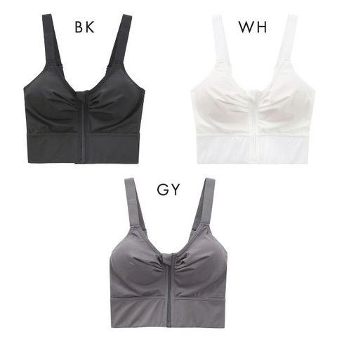 | 仕 様 | ・前開き(フロントジップタイプ) ・脇高設計 ・吸汗速乾 ・アンダーゴムはホック付き(4段4列で調整可能) ・肩紐取外し:不可 ・ストラップ調整可能 ・パッド取外し:不可 ・ワイヤなし ・サイドボーンなし |