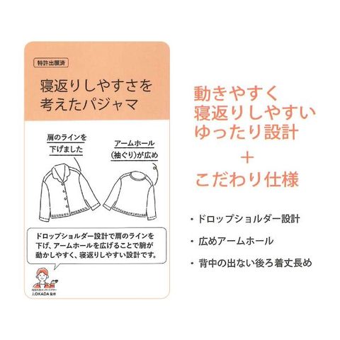 ドロップショルダー設計で肩のラインを下げ、アームホールを広げることで腕が動かしやすく、寝返りしやすい設計となっています。身生地は肌離れのよいワッフル素材を使用し、さらさらで快適な着用感です。