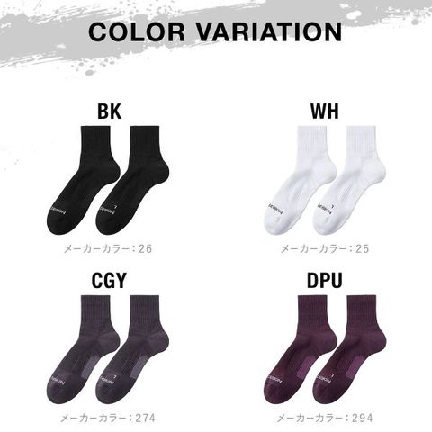 カラー BK-ブラック、WH-ホワイト、CGY-チャコールグレー、DPU-濃パープル、MUS-マスタード、DOR-濃オレンジ、HGY-杢グレー、DBR-濃ブラウン