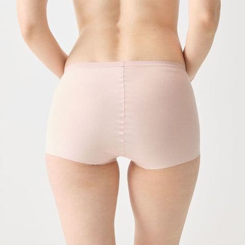 裾部分は、肌なじみよくショーツラインが目立ちにくい切りっぱなし始末。後ろマチのつなぎ目は、よりヒップの丸みに沿う立体設計にすることで、裾がズレ上がりにくいように仕上げています。