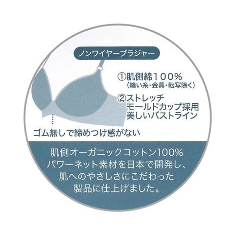 お肌に触れる面をすべて綿100%で仕上げたオーガニックコットン混素材を採用し、デリケートな肌を優しくいたわりながら、天然素材ならではの安心感と快適さを提供します。アンダーゴムをなくした設計で締め付けを軽減しつつ、内蔵されたモールドカップがバストを優しく包み込んで美しい形を整える、肌へのいたわりと理想的なバストシルエットを両立したノンワイヤーブラジャーです。