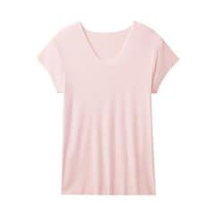 裾部分はきりっぱなし仕様(カットオフ)のため、風を纏うようなフラットな仕上がりで、アウターにひびきにくい。とろみ感のある滑らかレーヨン混素材を使用し、心地よい着用感を提供します。持続消臭加工でエチケット面にも配慮されたアイテムです。