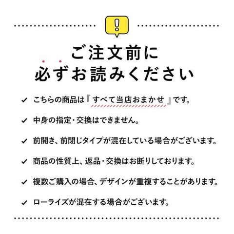 | 仕 様 | 【注意事項】 ※前開き、前閉じタイプが混在している場合があります。 ※ローライズが混在する場合があります。 ※こちらの商品は、カラー・デザインお任せです。 ※複数ご購入の場合、同じセット内容のお届けになる場合があります。 ※商品の性質上、返品・交換等はお受けできません。 ※事前にセット組みしているため、注文時の備考欄などのご希望に添うことができません。あらかじめご了承ください。 |