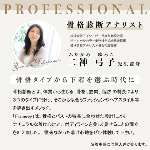 骨格タイプ別に設計されたブラジャーFrameey(R)フレーミーは、骨格診断アナリストの二神弓子先生と創業90年のメーカールシアンの共同開発により誕生。骨格とバストの特長に合わせた設計により、ナチュラルな着け心地とボディラインを美しく見せることの両立を目指して開発しました。