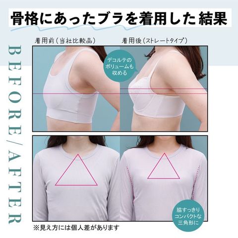 骨格ストレートさんに向けて、外向きになりやすいトップバストをしっかり支えるシルエット設計で、着ぶくれを防ぎ、肩紐がズレにくい工夫も施されています。カップ脇ホルダーで脇ラインをすっきり見せ、上胸をしっかり収めることで高さを軽減しました。※1