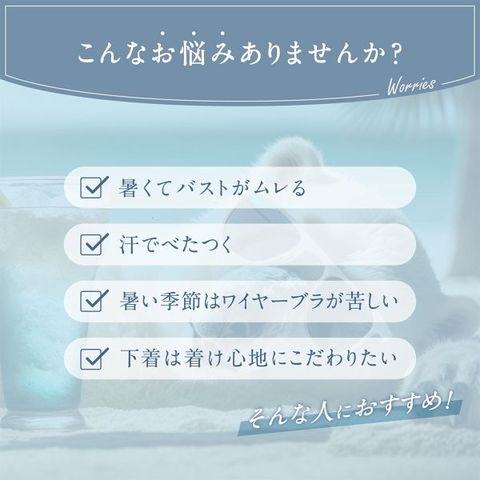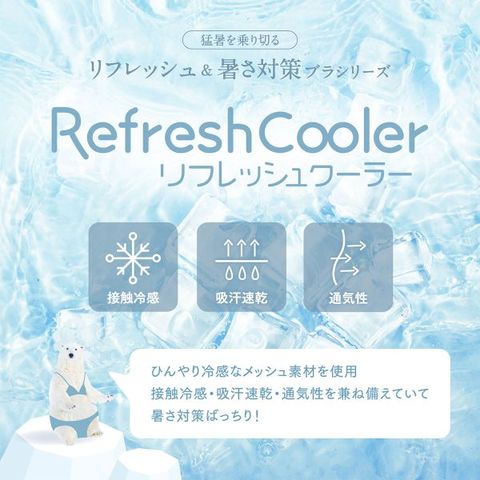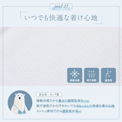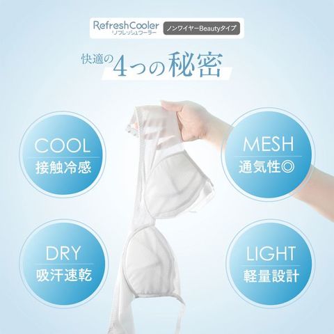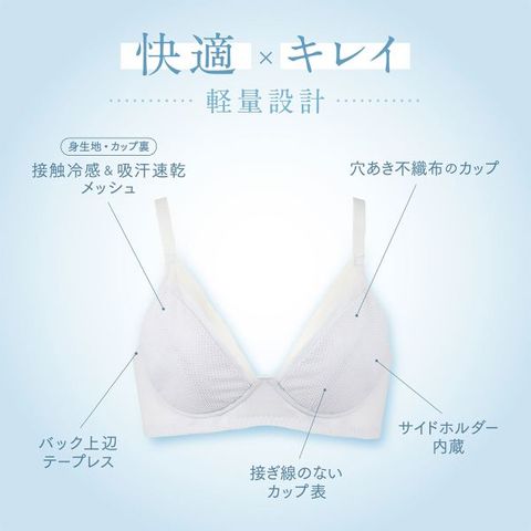 暑くてバストがムレる、暑い季節はワイヤーブラが苦しい・・そんな方におススメです。メッシュ素材を使用し、接触冷感、吸汗速乾、通気性を兼ね備えて、厚さ対策もばっちり!セットのパッドも穴あき仕様で、通気性も抜群です。