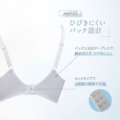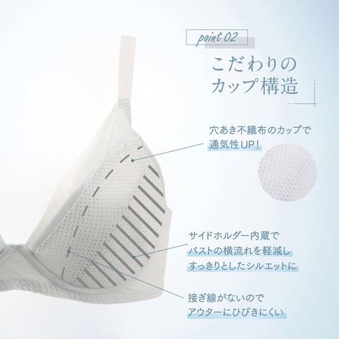 サイドホルダー内臓で、バストの横流れを軽減し、すっきりとしたシルエットに。カップの表面は接ぎ線がないので、アウターに響きにくく、薄着の季節も安心です。バックスタイル上辺はテープレス。締め付けず、ひびきにくい仕様です。