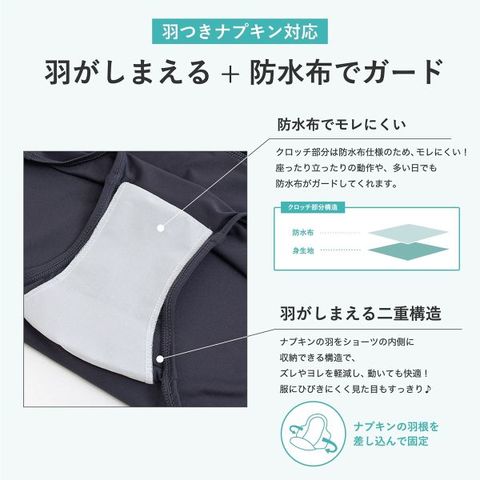 スポーティーなサニタリーショーツが登場!マチ部分は羽付きナプキン対応。防水布なのでモレをガードしてくれます。ヨガやダンスなどの軽スポーツだけでなく、スポーティMIXなカジュアルコーデにも使えるスタイリッシュなデザインです☆
