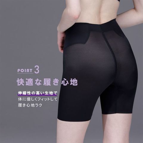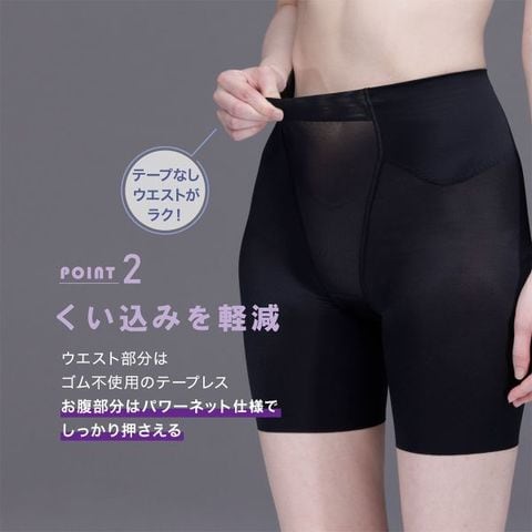 ハリのある生地が、腰まわりのお肉をしっかりと押さえ、スッキリとしたウエストラインを作ります。さらに、ウエスト部分はテープレスで、締めつけによるくい込みを軽減。