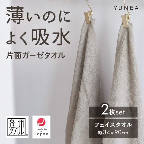 日本製 フェイスタオル 2枚セット ガーゼ 片面ガーゼ 吸水 速乾 薄手 コンパクト おしゃれ 無地 まとめ買い ギフト YUNEA