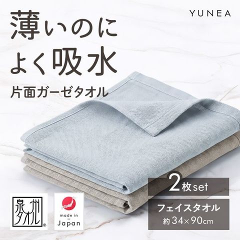 日本製 フェイスタオル 2枚セット ガーゼ 片面ガーゼ 吸水 速乾 薄手 コンパクト おしゃれ 無地 まとめ買い ギフト YUNEA