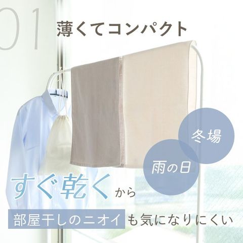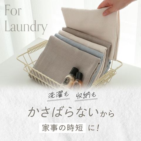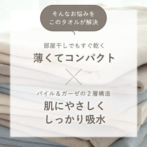 一般的なタオルよりも薄手のため、畳んでもかさばらず収納も省スペース。さらに乾きも早く、部屋干しや梅雨の季節にも大活躍。洗濯の負担を減らしながら、いつでも清潔に暮らしに馴染んでくれます。