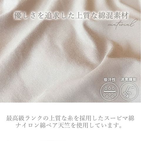 身生地は美しい光沢感と優しい肌触りのナイロン綿ベア天竺素材を使用。伸縮性が良く締めつけ感が少ないため、楽な着心地で体の動きにフィット。
