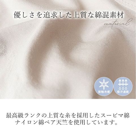 身生地には吸汗・速乾性に優れ、汗をかいてもサラッと快適なナイロン綿ベア天竺素材を使用。洗濯を繰り返しても毛玉ができにくく、やわらかくなめらかな肌あたり。さらに、接触冷感機能付きのため季節を問わずデイリー使いがしやすいアイテムです。