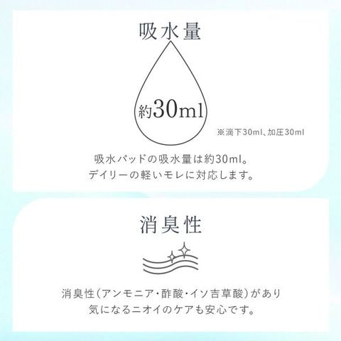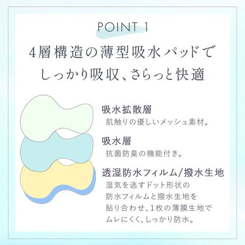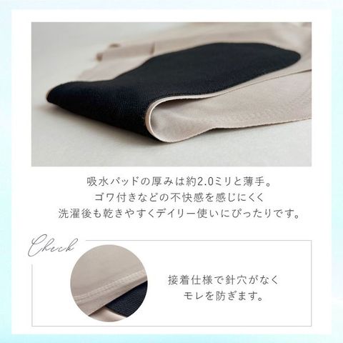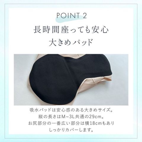 吸水パッドは長時間座るシーンでも安心の大きめサイズ。約2.0mmの薄型ながら、吸水拡散層・吸水層・透湿防水フィルム・撥水生地からなる四層構造でしっかり吸水します。